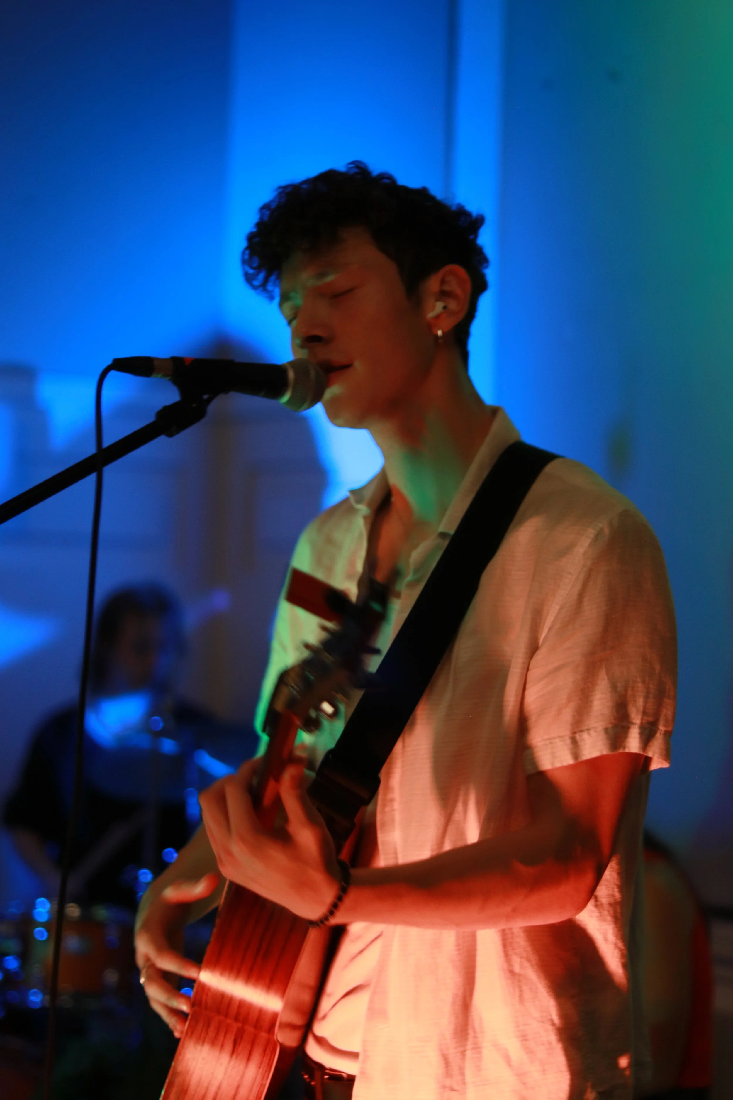 Zach performs live at Campbell Community Center with a three-piece backing band.